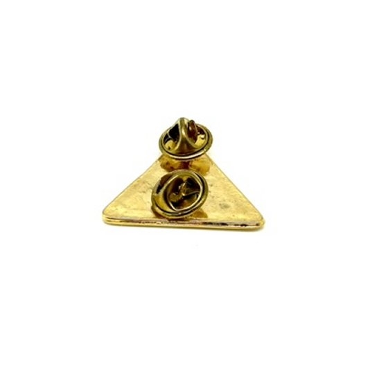 Spilla in metallo dorato. Dotata di due chiodi a morsetto. Il lato del triangolo misura 3 cm. Al centro lo stemma della trinacria, simbolo della Sicilia è in rilievo. peso lordo: 10 grammi.