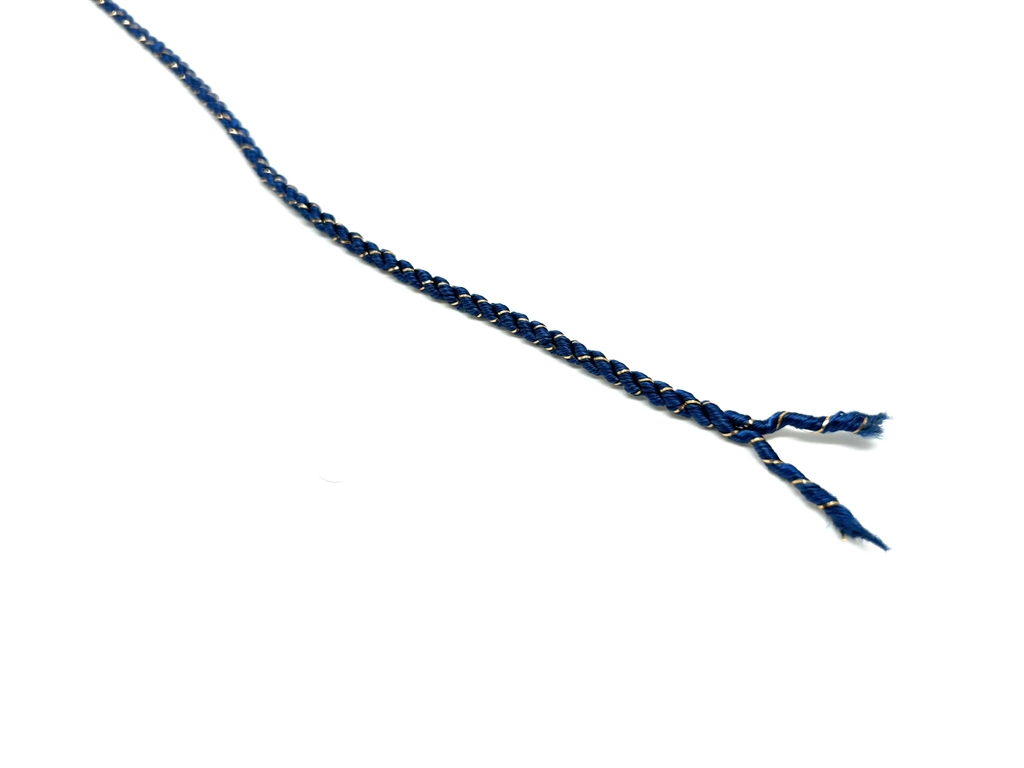 Corda in tessuto intrecciato. Colore blu con lurex dorato. Diametro 4 mm. Peso lordo: 5 grammi. Adatta per svariati usi. Vendita al metro.