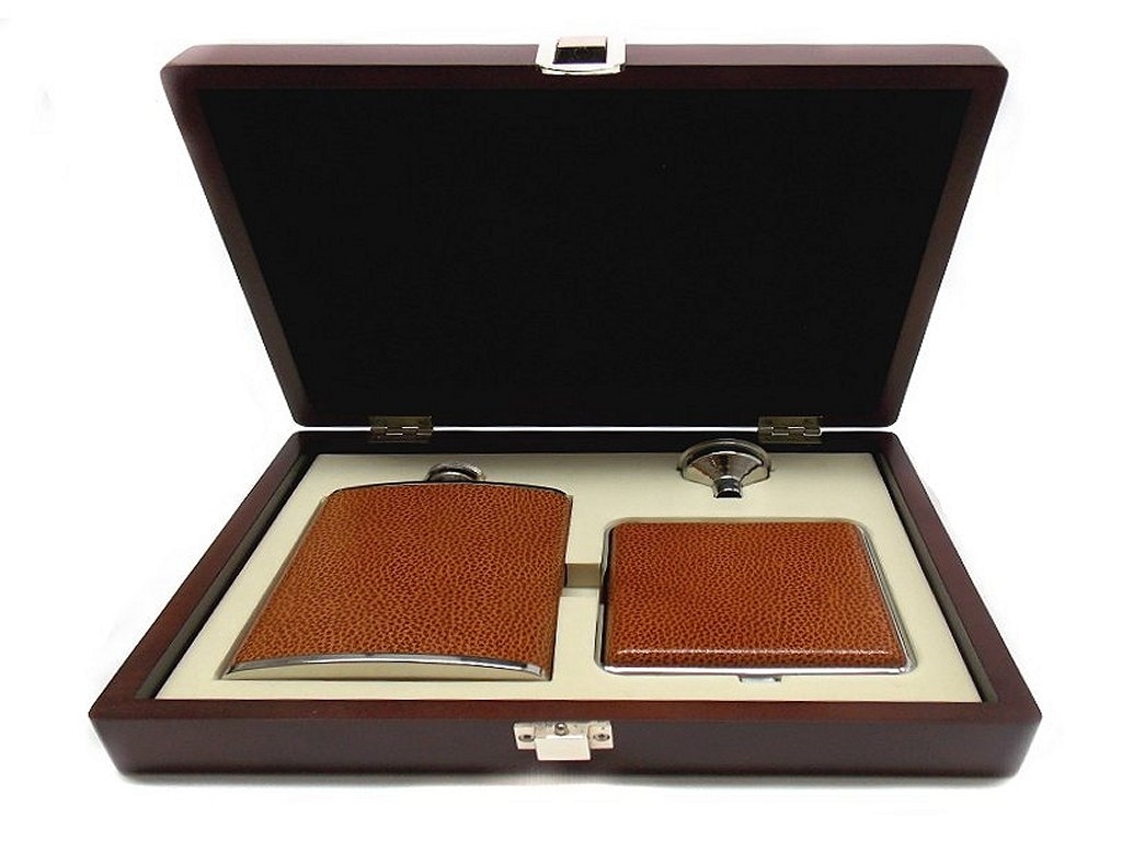 Set composto da fiaschetta porta liquore in acciaio rivestita in pelle di bufalo martellato. Completa di piccolo imbuto in acciaio per il riempimento. Tappo ermetico di chiusura con levetta di ancoraggio. Capacità di contenimento 180 ml (6 oz). Dimensioni: 12x9x2 cm. Portasigarette rivestito in pelle di bufalo martellato. Dimensioni: 10x9,5 cm. Dotata di cofanetto in legno di mogano con all'interno gomma sagomata. Dimensioni del cofanetto: 24x19,5x6 cm. Ottima idea regalo. Peso lordo: 980 grammi.