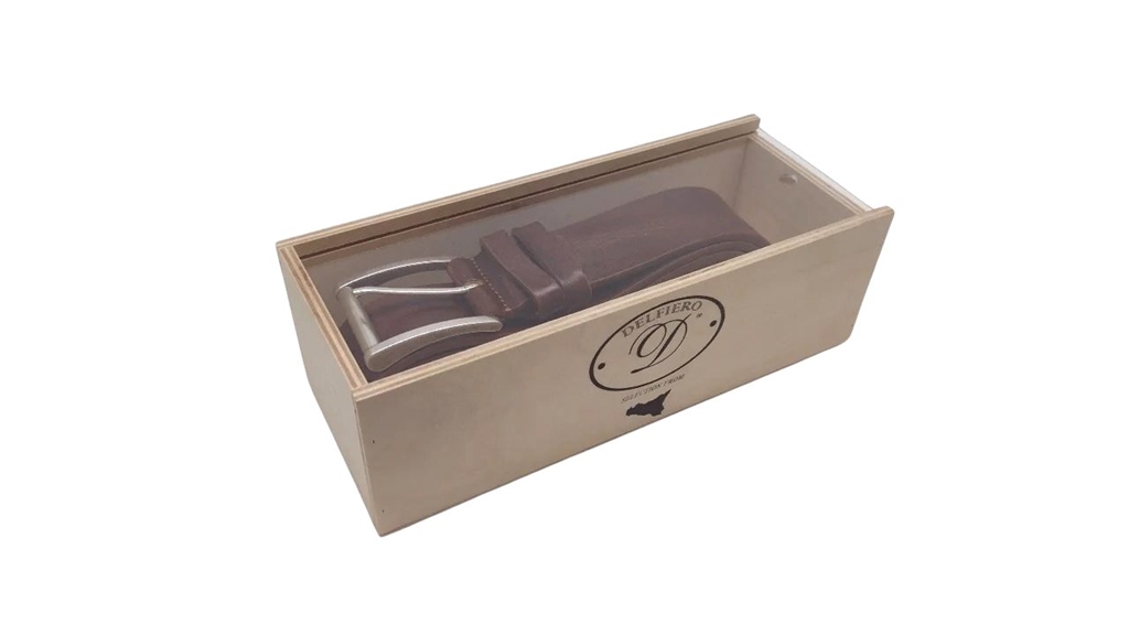 Confezione Delfiero in vetrina legno con Cintura Italiana Delfiero Overs Vintage in Cuoio Extra Colore Rum 40 mm con fibbia in Ottone Argento