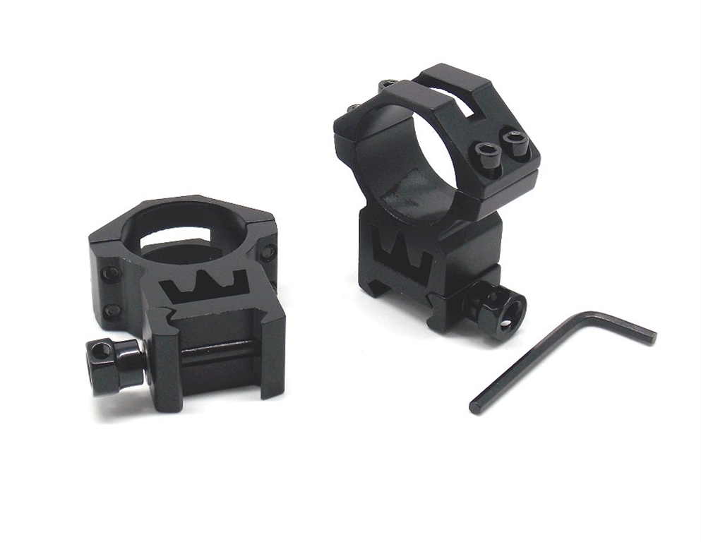 Coppia anelli in allumino per cannocchiali da 30 mm di diametro centrale con passo largo per slitte weaver 15/17mm. Distanza tra base inferiore attacco e centro anello: 3,5 cm. Altezza massima 6 cm. Peso lordo: 130 grammi. Prodotto in Cina.