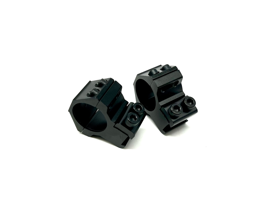 Coppia di anelli in alluminio per cannocchiale con tubo da 25 mm di diametro. Distanza tra base inferiore attacco e centro anello: 3 cm. Con perno ferma slitta. Peso lordo: 158 grammi.