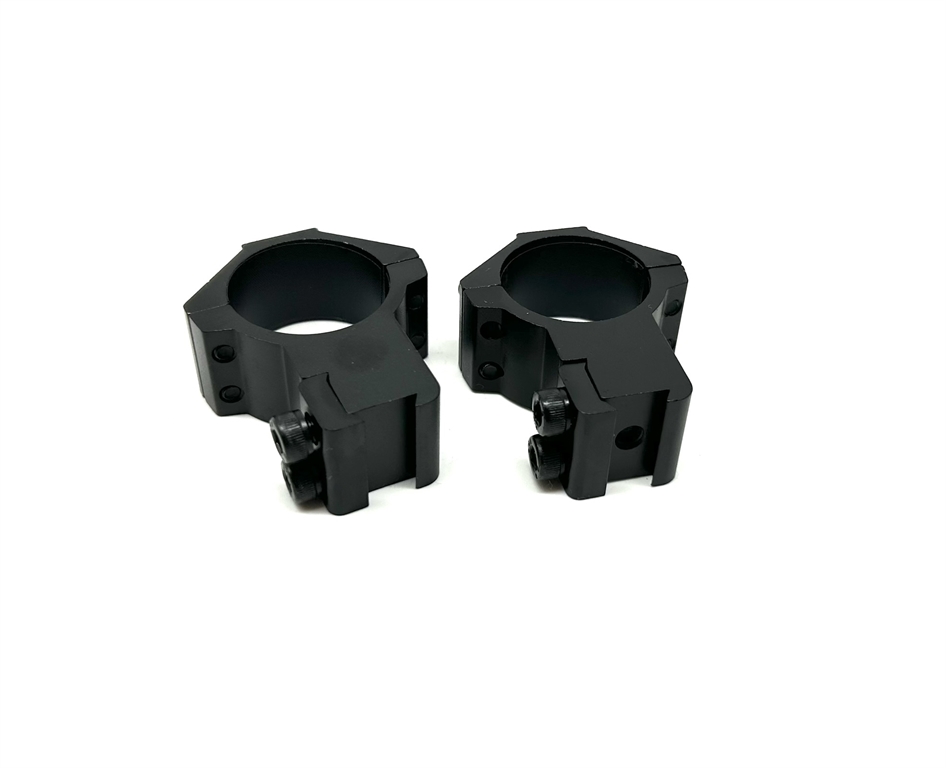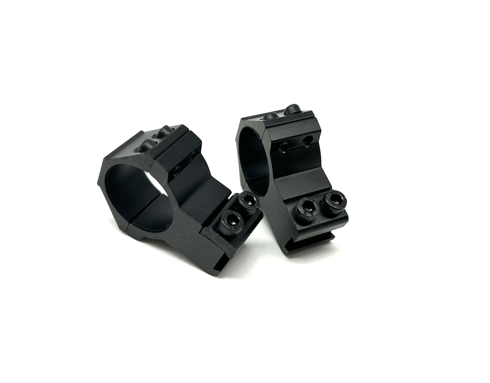 Coppia di anelli in alluminio per cannocchiale con tubo da 30 mm di diametro. Distanza tra base inferiore attacco e centro anello: 3,8 cm. Con perno ferma slitta. Peso lordo: 178 grammi.