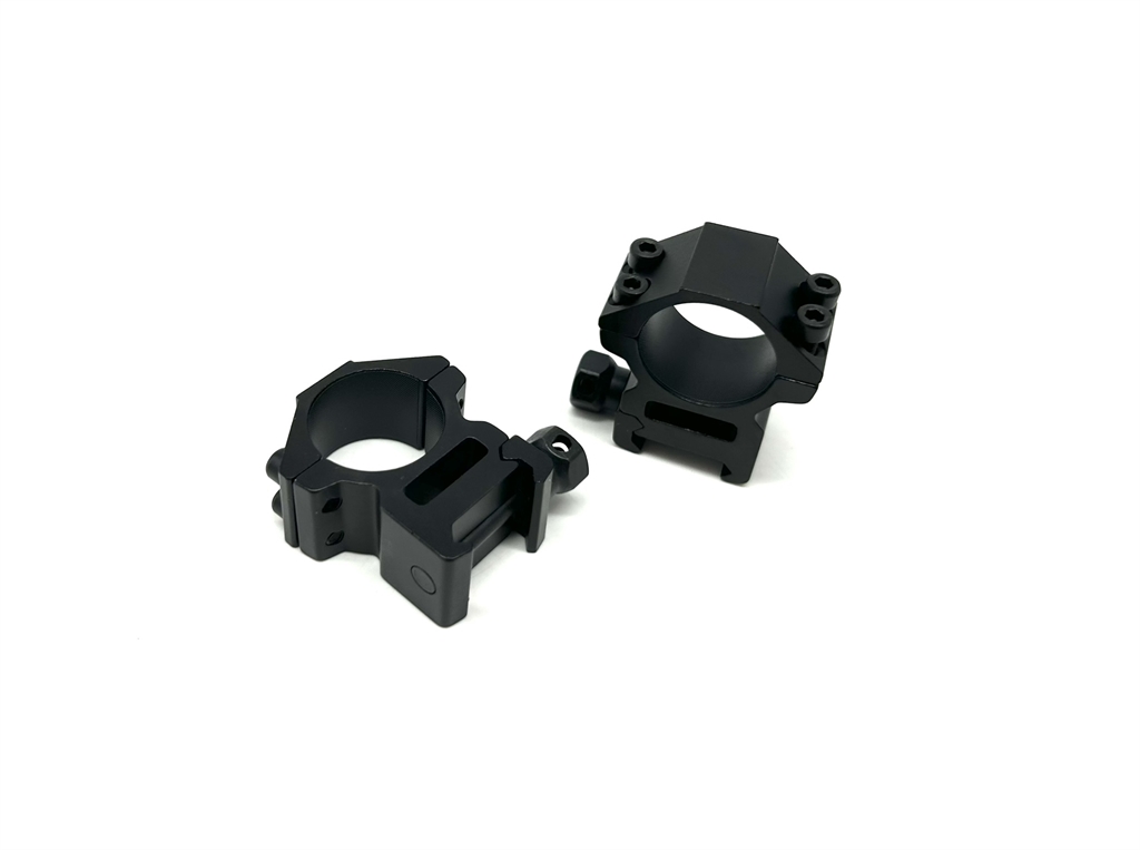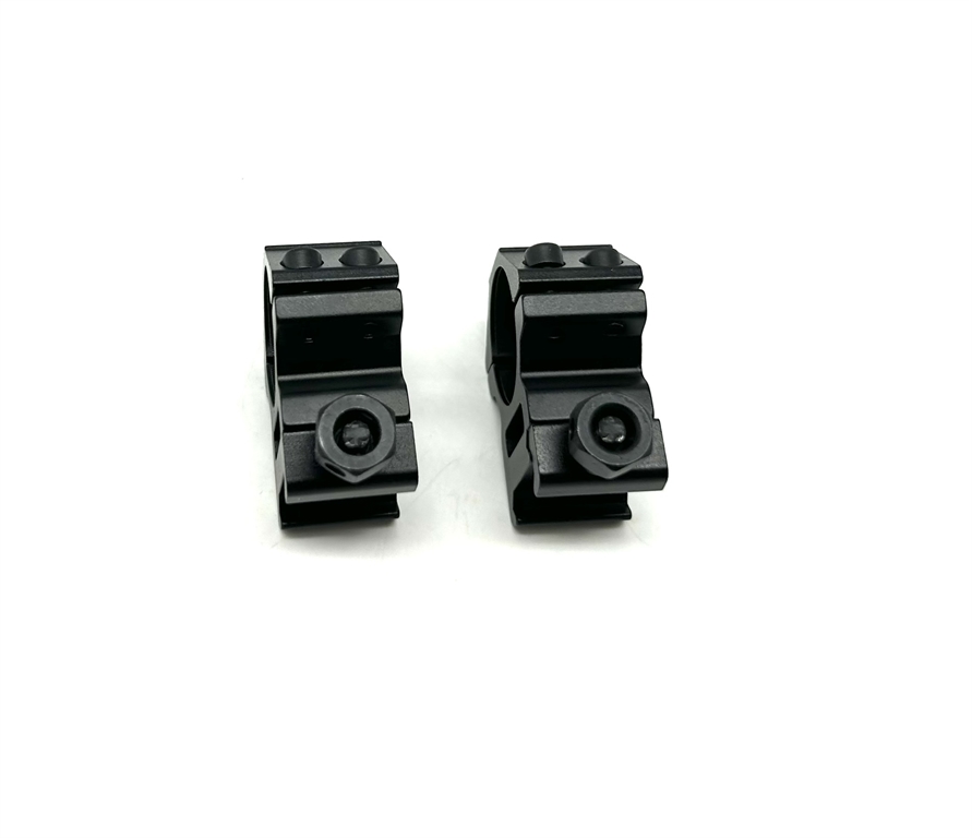 Coppia di anelli in alluminio per cannocchiale con tubo da 25 mm di diametro. Distanza tra base inferiore attacco e centro anello 3,3 cm. Con perno ferma slitta. Peso lordo: 158 grammi.