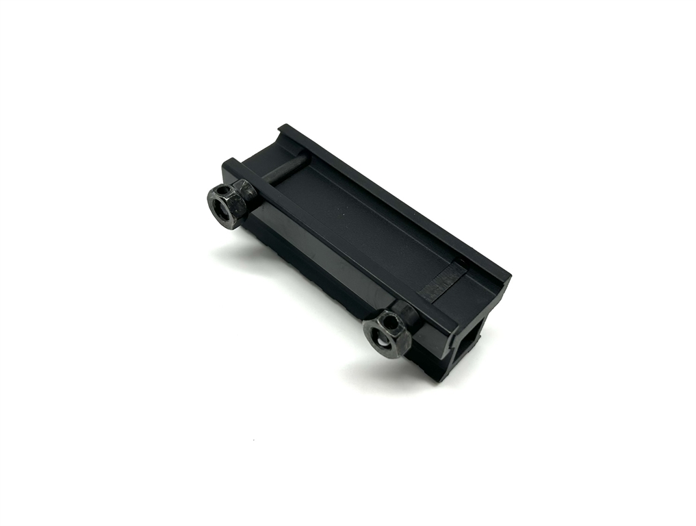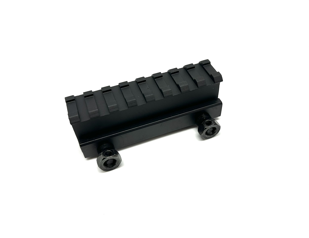 Slitta in metallo. Altezza 3 cm, lunghezza 8,5 cm. La base si rialza di 20 mm. Distanza tra le scanalature: 5 mm. Peso lordo: 110 grammi. Slitta weaver su weaver.
