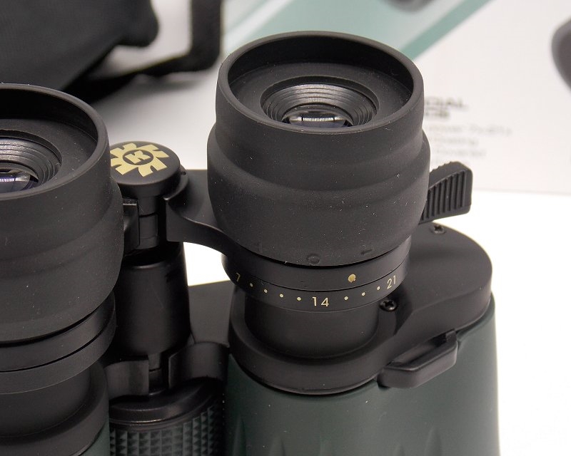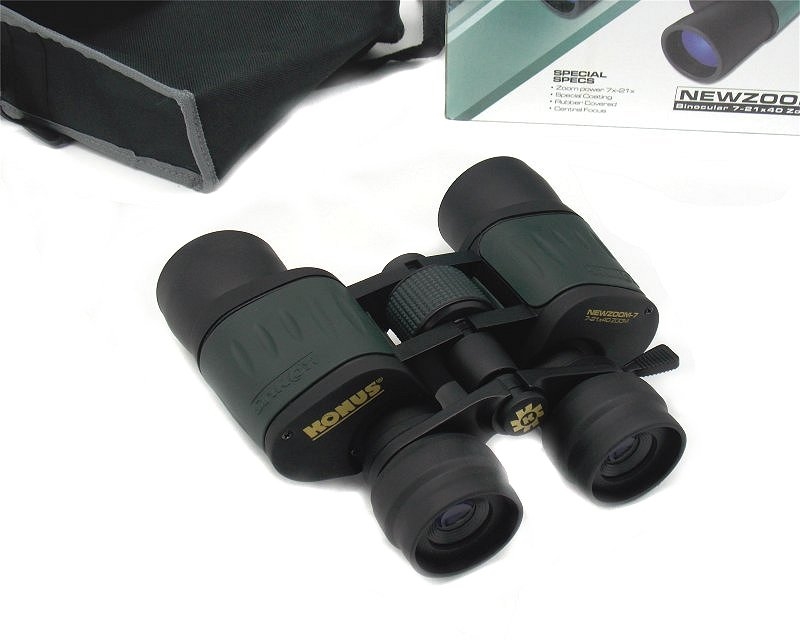 Binocolo gommato verde e nero. Ingrandimento massimo 7x, zoom ottico 21x, diametro lenti 40 mm. Messa a fuoco centrale. Campo visivo a 1000m: 96mt a 7x - 43mt a 21x. Dotato di custodia in tela nera con tracolla regolabile e passante per cinturoni alti 5 cm e di cinghietta per metterlo al collo. Fornito di copri oculari. Peso: 720 grammi. Lunghezza: 17 cm. Larghezza massima: 18 cm. Adattabile al treppiedi, non in dotazione. Peso lordo: 881 grammi