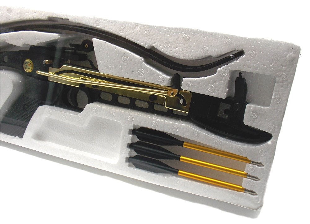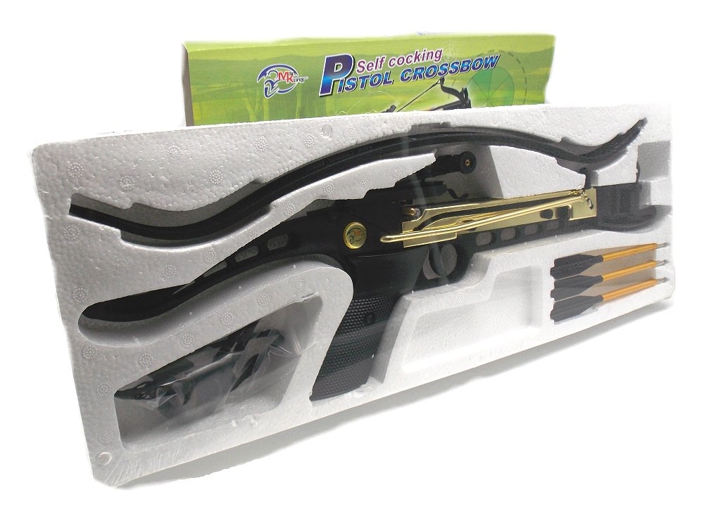 Balestra con forma e dimensioni di pistola. Corpo interamente in metallo con calcio rivestito in plastica. Peso 750 grammi. Lunghezza cm 32. Archetto in fibra 80 lbs con alzo di mira micrometrico e sicura. Staffa e maniglia posteriore di aiuto caricamento. Nella confezione sono comprese tre frecce con punta in alluminio. Peso lordo: 1075 grammi.