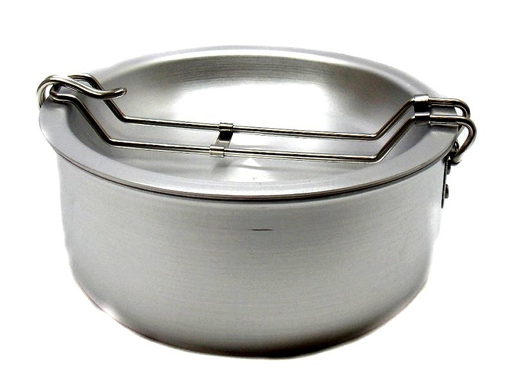 Gavetta in robusto alluminio lucidato. La scatola contiene 1 pentola con manico di chiusura, 1 padella con manico pieghevole, 1 piatto fondo alluminio. I tre pezzi sono impilabili. Dimensioni da chiusa: diametro 17,5 cm, altezza 7 cm. Peso lordo:490 grammi.