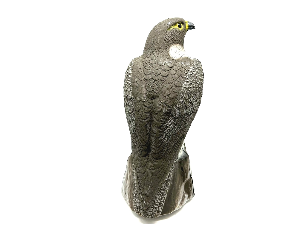 Falco in plastica, vuoto all interno con possibilità di riempirlo tramite apposito tappo situato alla base. Altezza 41 cm, larghezza 17 cm. Per il massimo risultato è molto importante che il falco venga cambiato saltuariamente di posizione in quanto gli uccelli tendono ad abituarsi. Prodotto fatto i Italia.