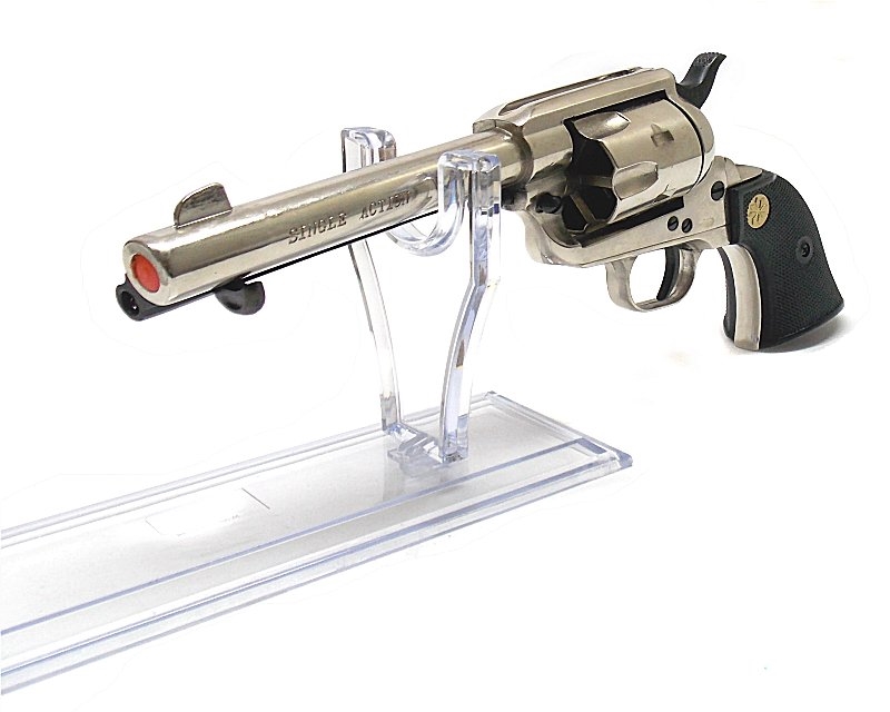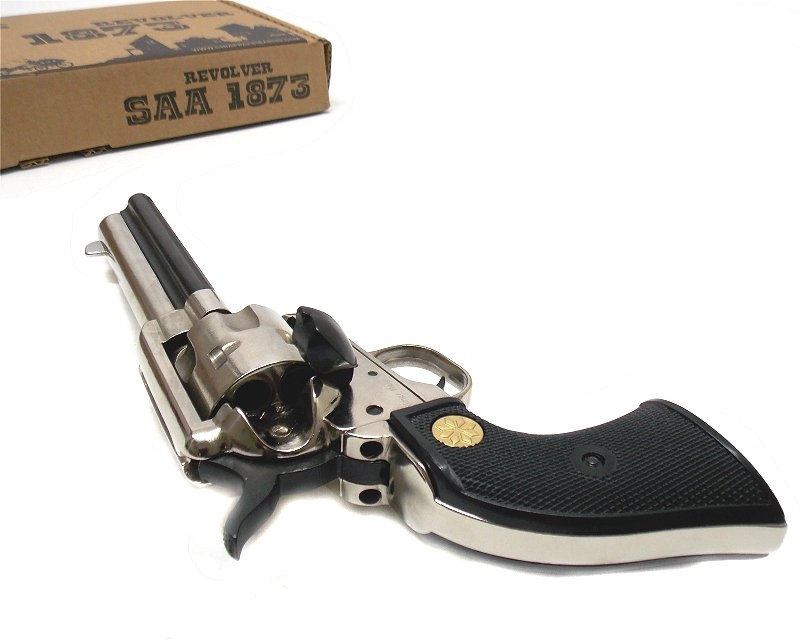 Strumento dissuasore a segnalazione acustica riproducente revolver singola azione 6 pollici in lega di zinco. Simile per dimensione e forma ai revolver del FarWest. lunghezza 26,5 cm, altezza massima 13 cm. 6 colpi, dotato di manuale. Modello top firing di libera vendita in Italia. Questa arma a salve è stata testata dal banco nazionale di prova italiano che ha apposto i suoi punzoni sul fusto per conformità e regolare funzionamento. Funziona con cartucce calibro 380 a salve. Colore inox con guancette in plastica nera. Prodotto in Italia. Peso lordo: 1042 grammi,destinata esclusivamente a uso scenico,da segnalazione o collezionistico,età consigliata per acquisto 18+.