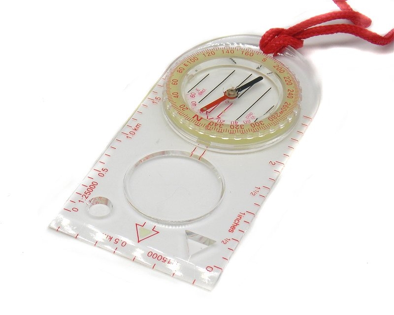 Bussola per orienteering con scala in pollici e scala di rappresentazione 1:25000, lente di ingrandimento e fori sagomati per tracciamento simboli sulla mappa. Quadrante con ghiera e riferimenti fluorescenti. Dimensioni 11,5x5,5 cm, cordino in nylon per il trasporto. Peso lordo: 53 grammi.