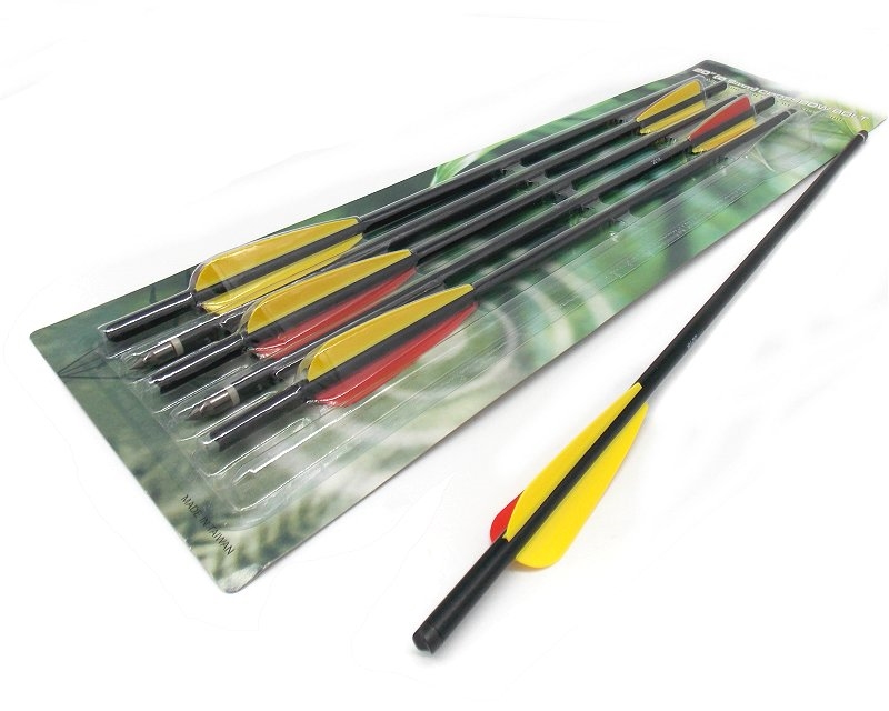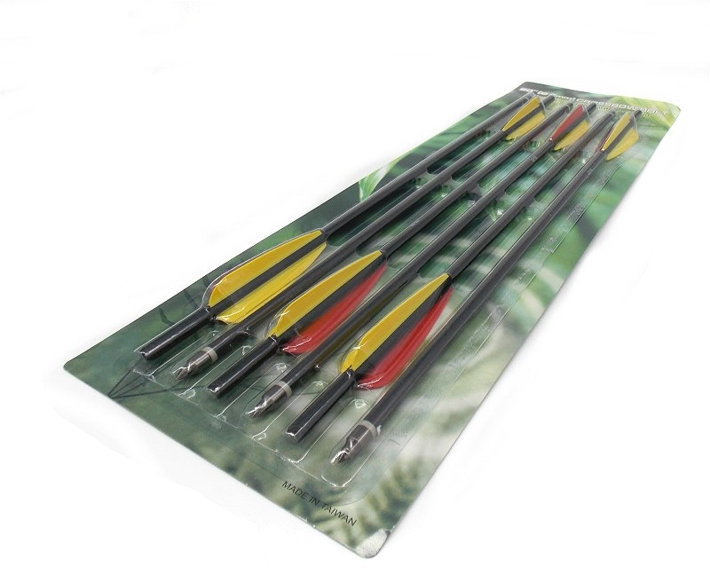Blister da 6 frecce per balestra fucile. Lunghezza freccia 53 cm. Punta in acciaio svitabile ed alette in plastica morbida. Vendita esclusivamente in confezione da 6 pezzi come esposto in foto. Ideale per montarci le punte da caccia. Prodotto in Taiwan. Peso lordo: 280 grammi.