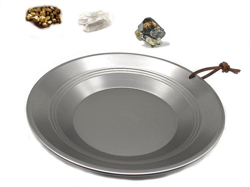 Padella in acciaio rigata per setaccio minerali alluvionali. Diametro 30 cm, altezza 5 cm, peso circa 420 grammi. Dotato di laccetto in cuoio per poterla appenderla. Peso lordo: 420 grammi. Prodotto in USA.