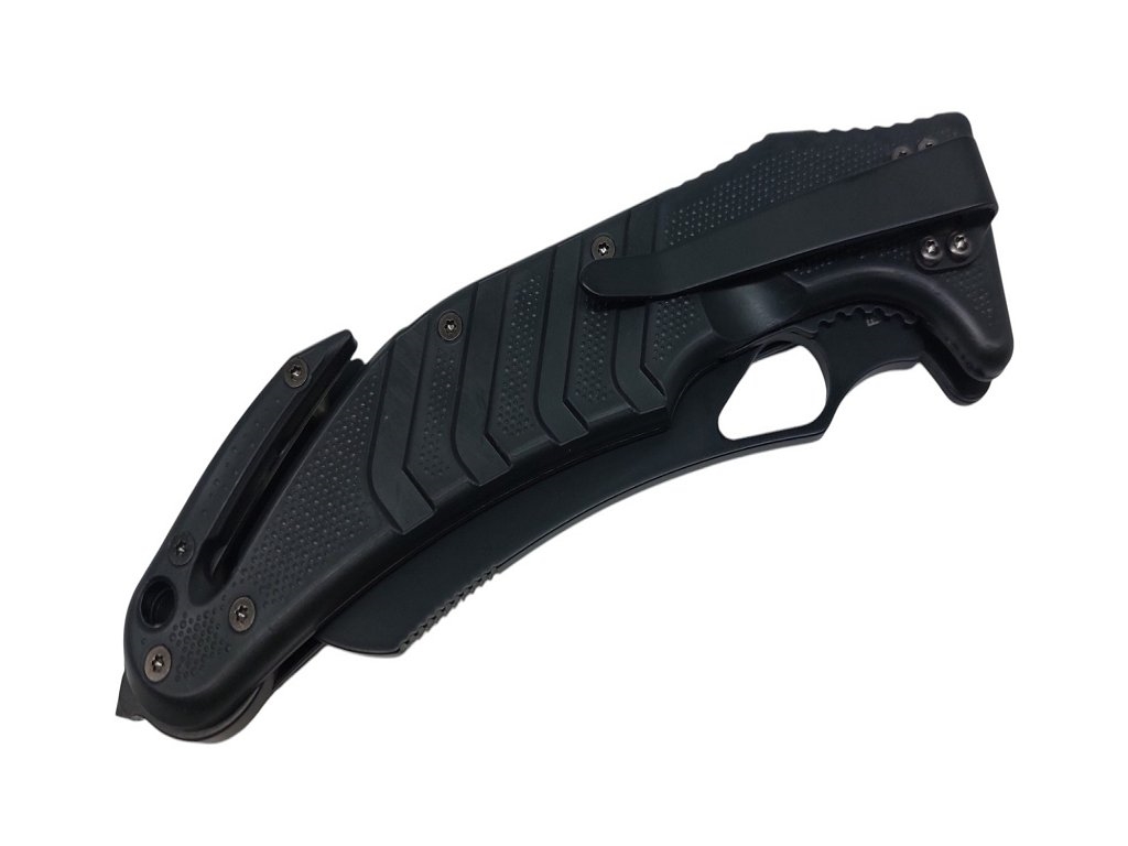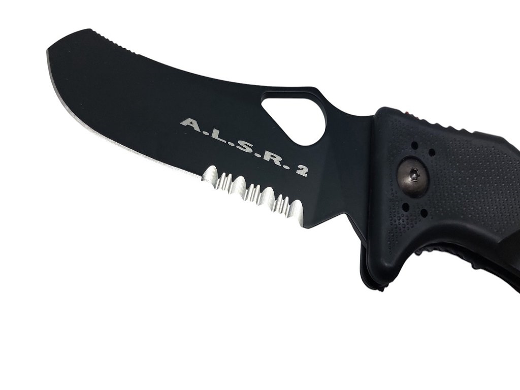 Coltello sportivo. Lunghezza lama chiudibile 8,5 cm, larghezza lama 2,5 cm, lunghezza totale aperto 24 cm. Dotato di una lama speciale per il taglio della cintura di sicurezza, di clip per metterlo al cinto e di un fodero. Lama di colore nera. Coltello ideale per la sicurezza in aria, terra e mare. Lama in acciaio inox cobalto vanadio n690 co con finitura al teflon. Manico in forprene aeronautico. Prodotto in Italia. Peso lordo: 229 grammi.